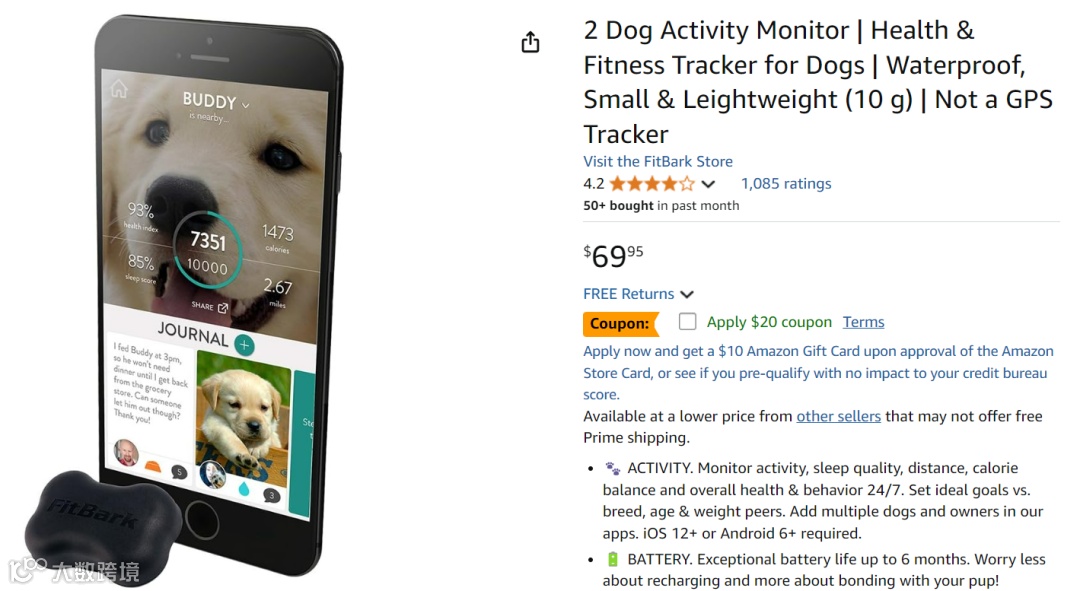 在亚马逊平台上,FitBark 2 成绩斐然。它收获了 4.3 星(满分 5 星)的评分,拥有 1076 条用户评价。