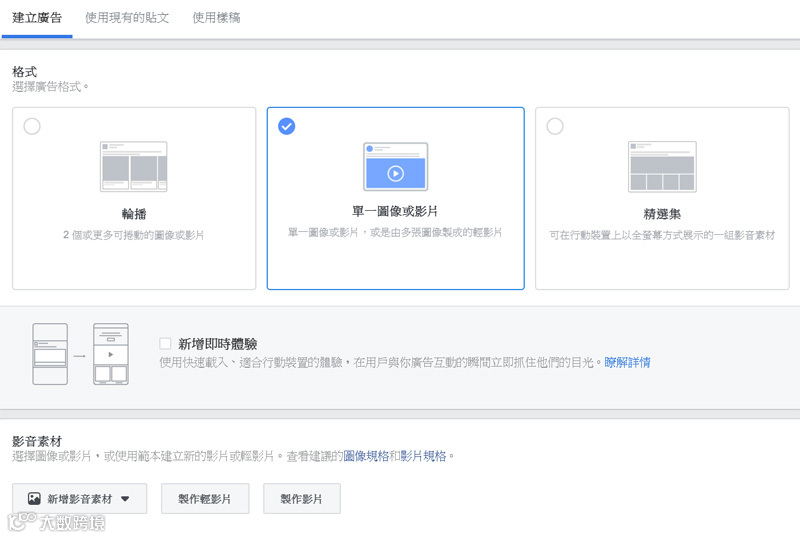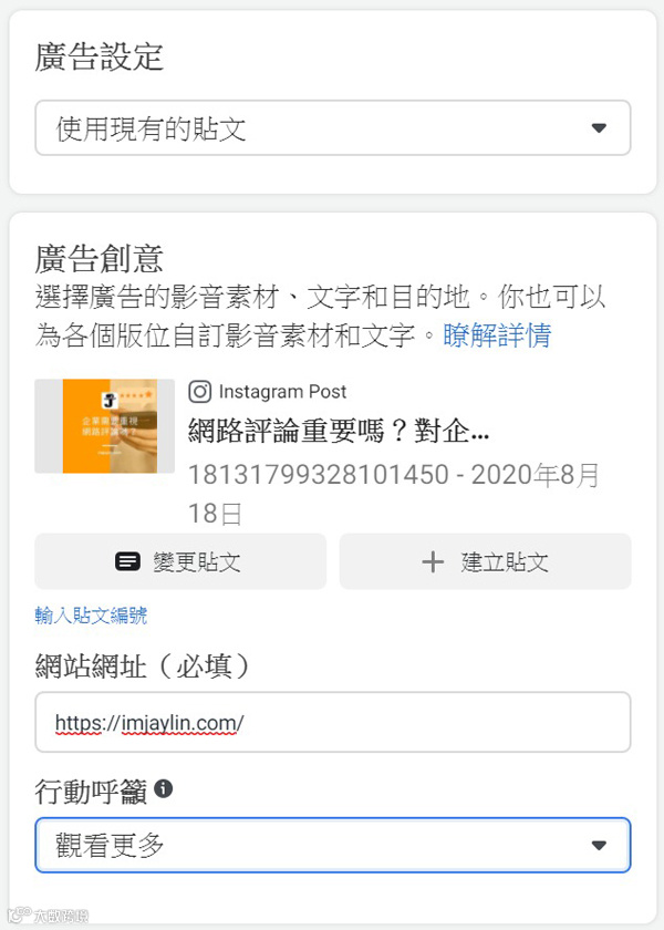 在广告创意部分,可选择“使用现有贴文”并点击“变更贴文”选取已发布的IG内容作为广告素材;或选择“建立广告”重新制作广告内容。