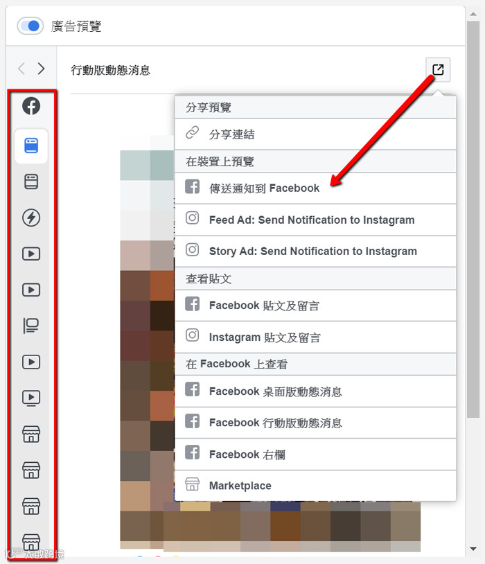如需预览广告效果,可在广告层级查看不同版位的展示效果,或通过广告链接直接查看贴文展示形式。(左侧提供版位预览选项,右上角支持设备预览功能)