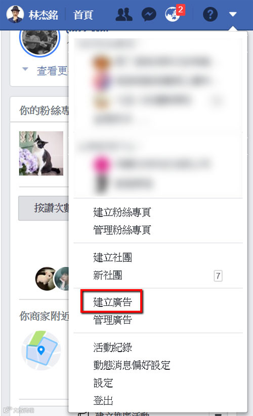 使用电脑访问Facebook,在右上角菜单中点击“建立广告”进入广告管理员界面(该选项同样出现在左侧导航菜单中)。