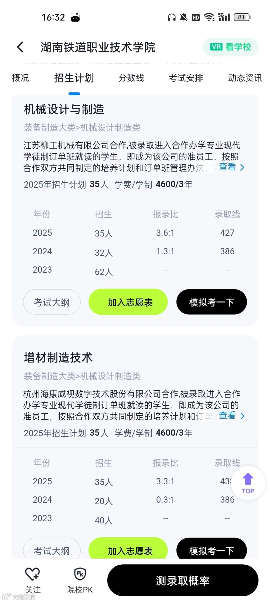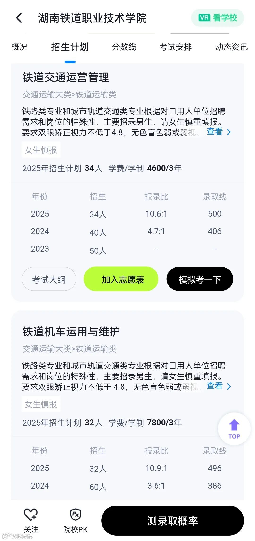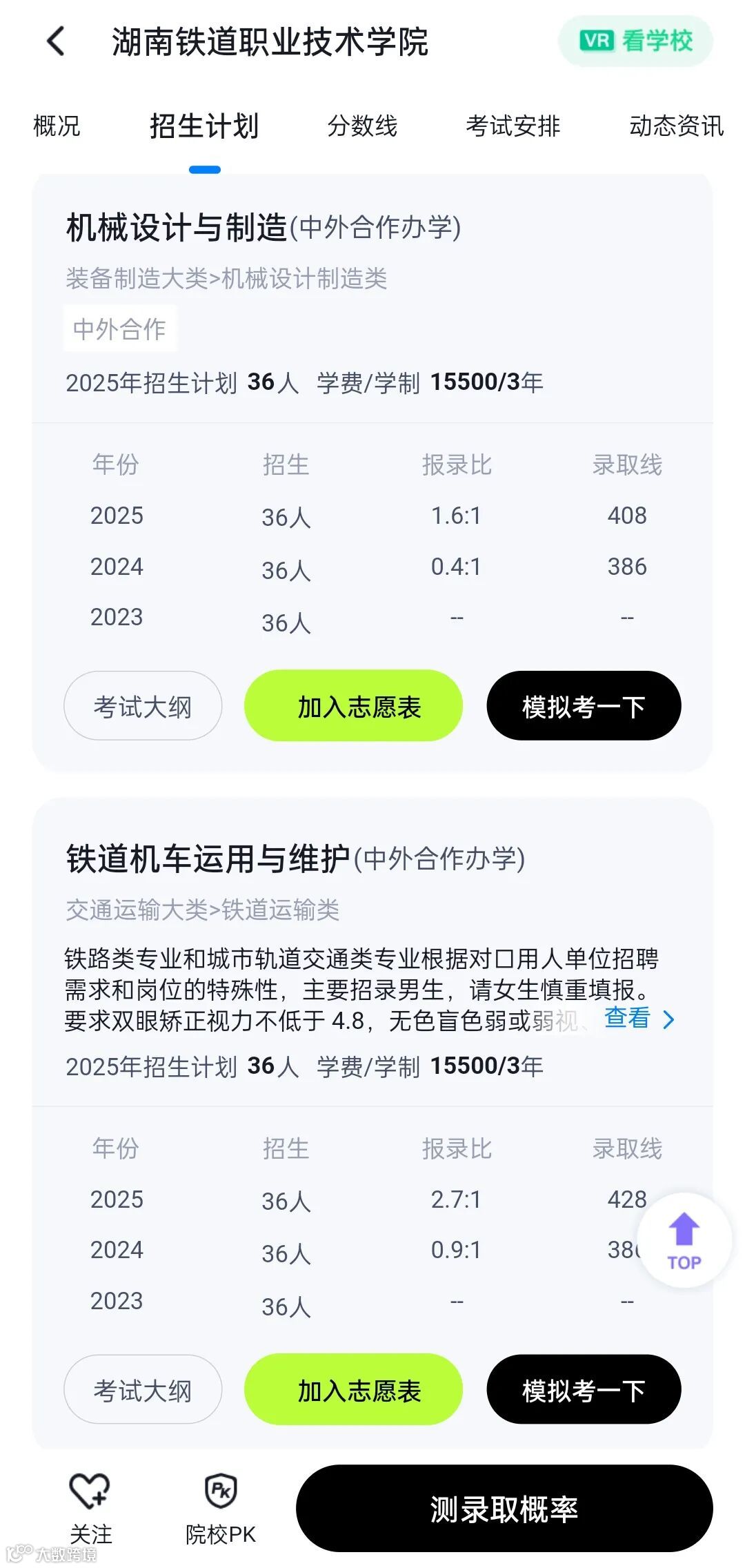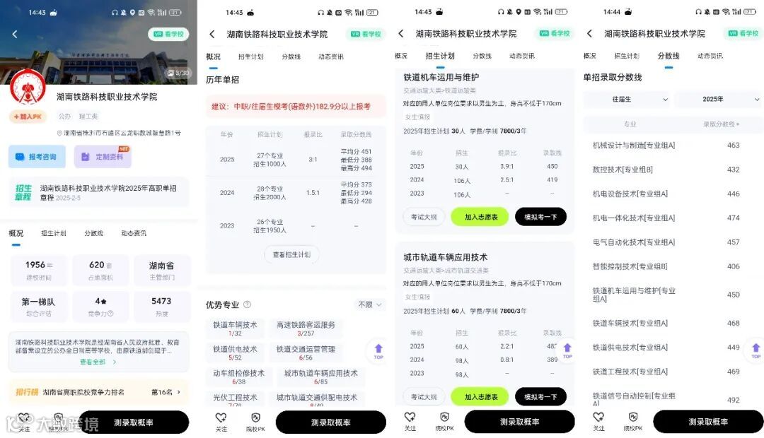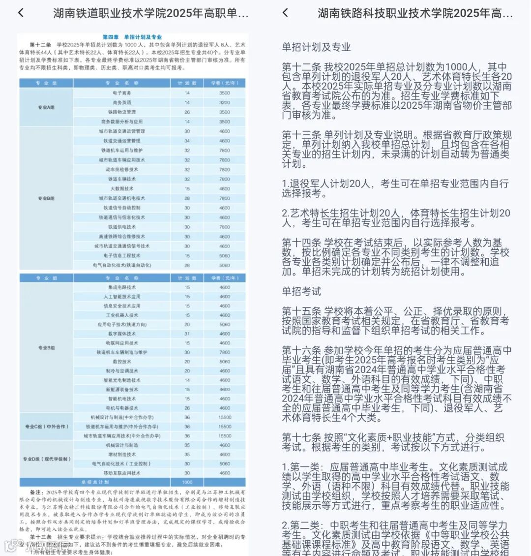 它会实时更新全省单招院校的最新信息,2026 年湖南铁道和铁路科技的招生计划一公布,你就能第一时间查到:分专业名额、报考要求、学费标准,甚至连往年录取分数对比都有。不用再在两校官网间反复切换,也不用怕错过政策变动(比如 2026 年可能新增的专业、调整的名额比例),真正实现 “一屏在手,全省院校任我查”!