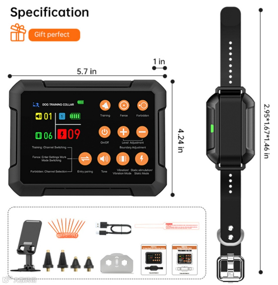 黑色+橙色的包装盒内有电子围栏的基站、宠物项圈、详细的使用说明书、充电线和备用电池等。
