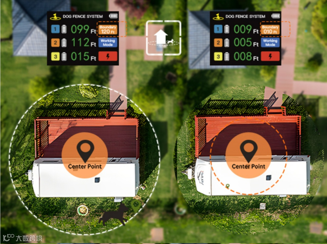 超大覆盖面积:针对不同家庭环境,设备的最大覆盖范围可达1英亩,活动距离可调节在10至120英尺之间,满足从小庭院到大院落的多样化需求。用户可根据场地大小和需求,灵活调整围栏覆盖半径,操作简单,无需重新安装设备。