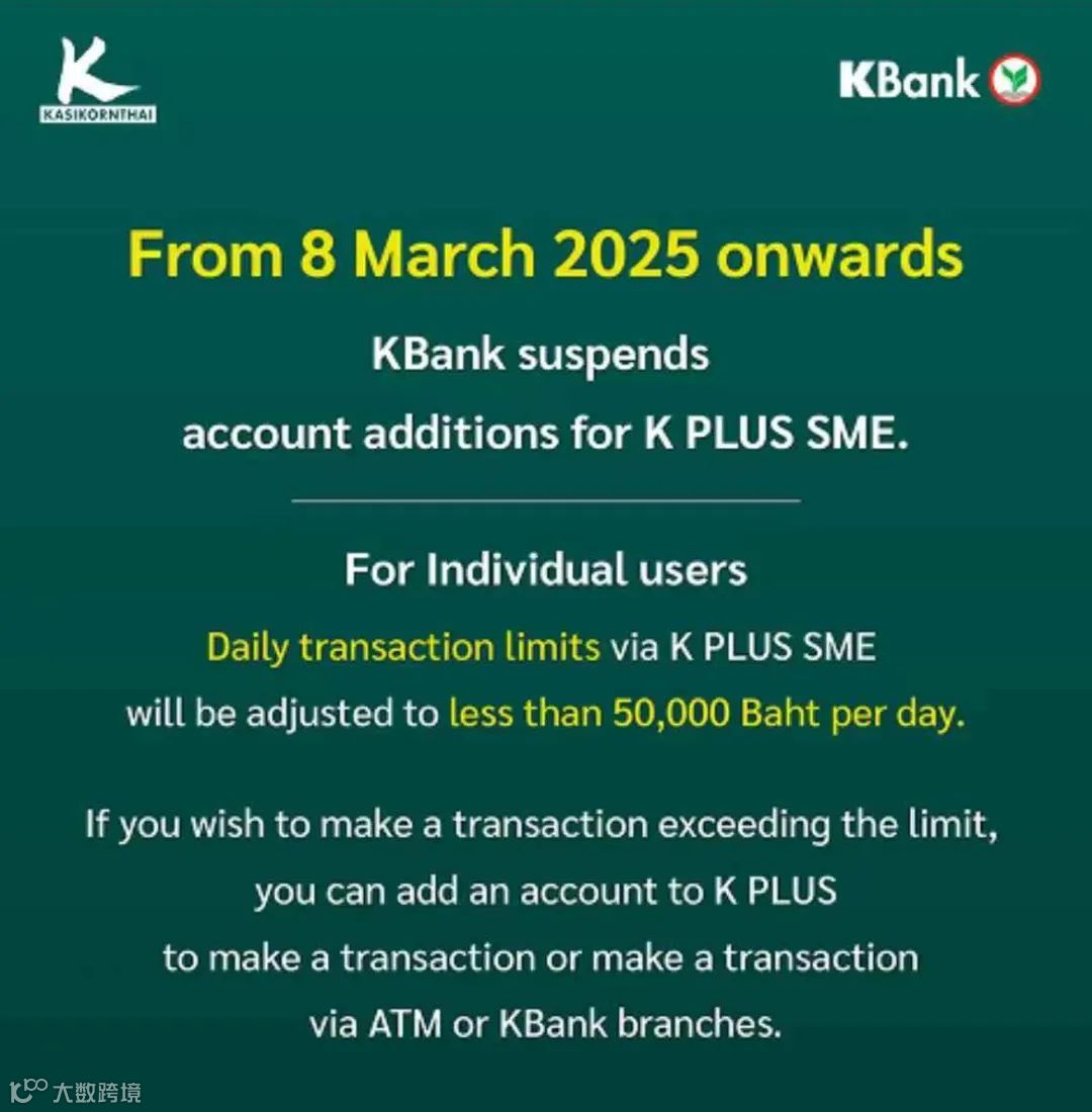 自2025年3月8日起,泰国开泰银行(KBank)宣布将暂停K PLUS SME账户的添加,并对个人用户的每日交易限额进行了调整。通过K PLUS SME进行的交易限额现为每天少于50,000泰铢。如果用户需要进行更高额度的交易,可以通过将账户添加到K PLUS应用、使用自动取款机或前往KBank分行完成。此外,根据泰国银行(BOT)的规定,为了增强金融交易的安全性,当转账金额达到或超过50,000泰铢,或者每日累计余额达到200,000泰铢时,用户需通过面部扫描确认身份。这一措施已被多家银行采纳,包括曼谷银行、暹罗商业银行(SCB)、开泰银行(KBank)、泰国军方银行泰纳昌银行(ttb)以及大华银行(UOB)等。