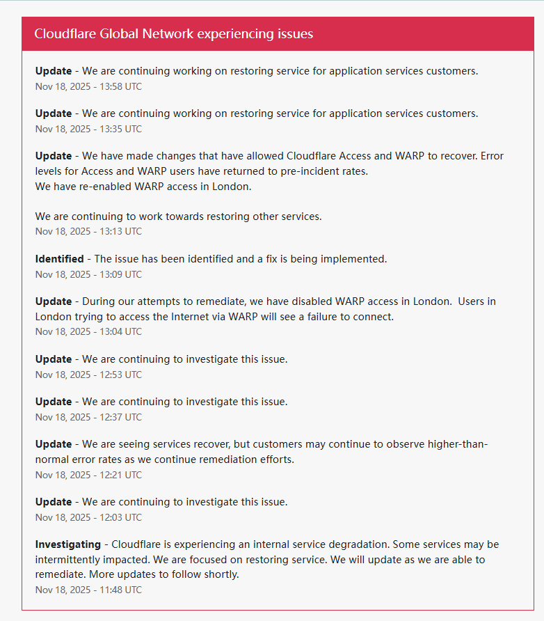 18日,知名网络基础设施公司Cloudflare表示,其全球网络出现问题,导致许多网站和应用程序的服务中断,包括X(原twitter)和ChatGPT在内的多家互联网平台无法访问。据媒体报道,Spotify和亚马逊也出现了服务中断。