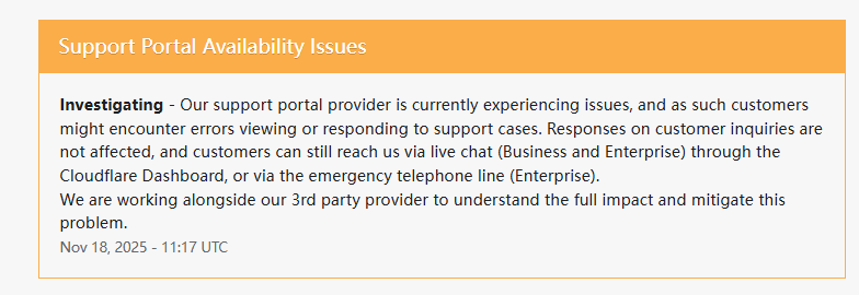 北京时间19:17(伦敦时间11:17),Cloudflare官网状态显示其支持的门户提供商目前遇到一些问题,因此客户查看或回复支持案例时可能会遇到错误。