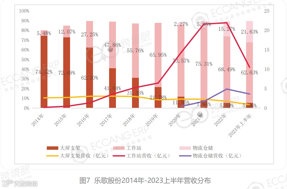 至2020年,大屏支架的营收占比仅11.95%,工作站占比却超过70%,顺利完成产品结构切换。这一年,乐歌股份又启动了海外仓业务。
