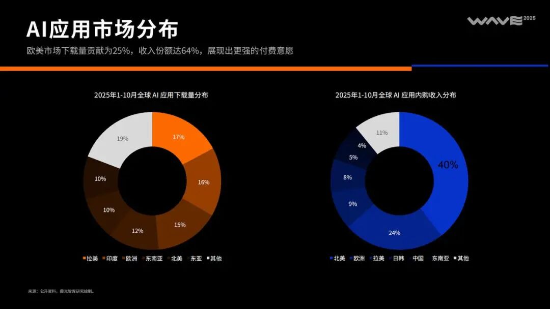 如今,AI应用已成为最具增长潜力的热门赛道。从年初引爆关注的DeepSeek,到后来的Manus,每一款现象级产品的出现都吸引了全球范围的广泛瞩目。数据显示,该细分领域在2024年实现了55%的收入同比增长,而今年前十个月的下载量与收入总额,更是已超越2024年全年表现。