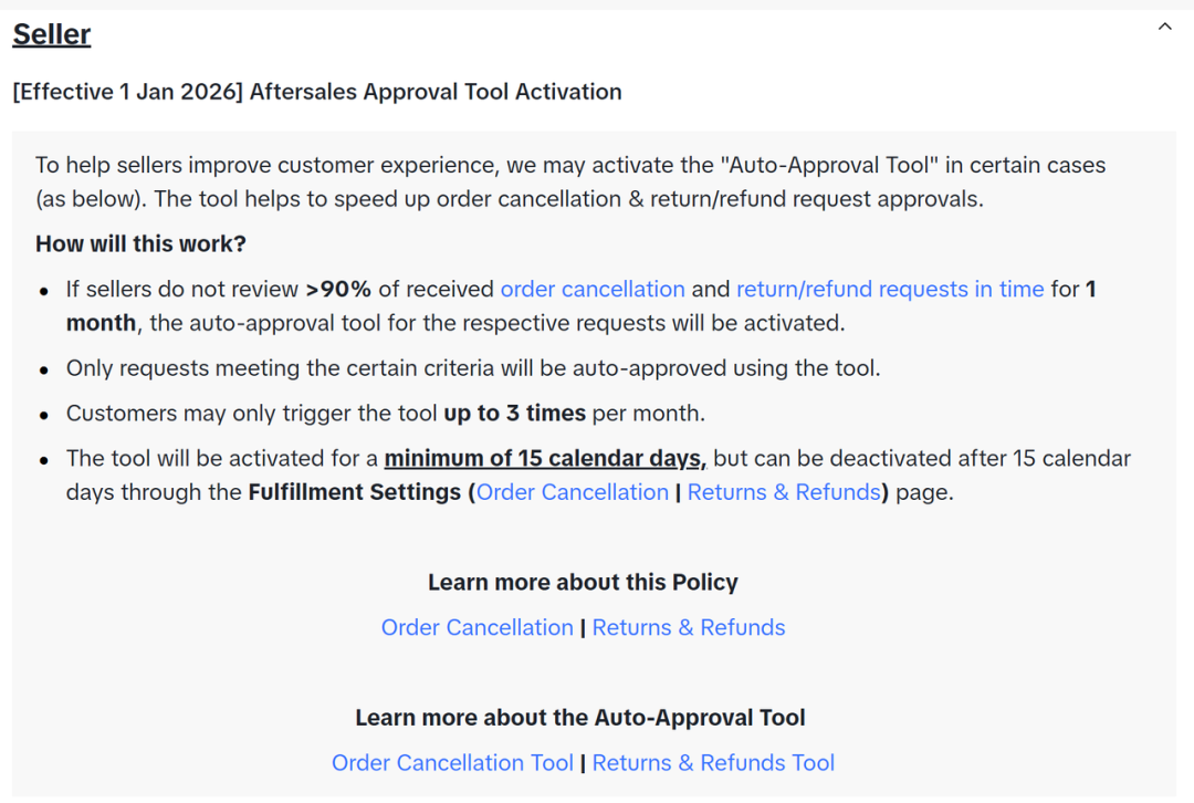 自2026年1月1日起,为帮助卖家提升客户体验,我们可能在特定情况下激活“自动审批工具”(如下所示)。该工具有助于加快订单取消及退货/退款请求的审批。