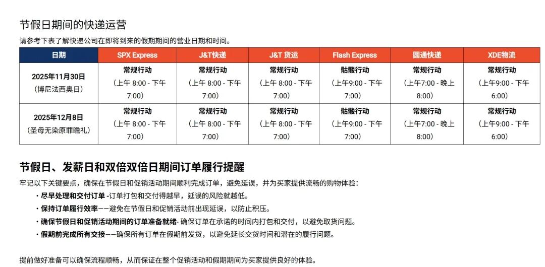 为了简化促销活动期间的订单履行流程,以下是即将到来的11.28 发薪日促销、12.12 双倍双倍促销和12.15 发薪日促销的相关指南,请您注意: