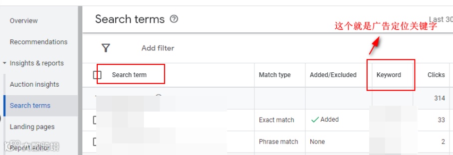 2. 被问到为什么有转化的搜索词跟他放在定位中的词不一样? 答案是:在搜索查询报告中,从列里把“Keyword””指标拉出来, 即把用户搜索词和定位词放到一起来分析匹配是否为广泛匹配或者是变体导致。