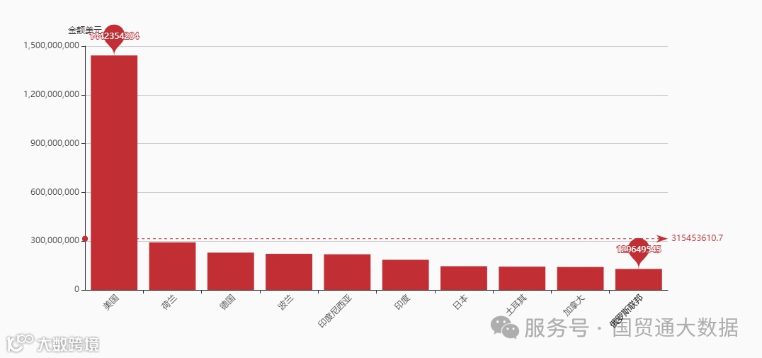 按国别统计,美国为最大出口市场,出口额14.4亿美元;荷兰和德国分列第二、三位,分别为2.9亿美元和2.3亿美元。对印度尼西亚出口额同比增长97.6%,主要受益于当地城市化进程加快、政策支持及环保意识提升[k]。