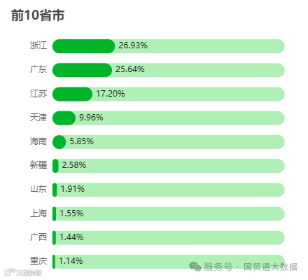 从出口省份看,浙江、广东、江苏、天津、海南位列前五,合计占比达85.58%。新疆、山东、上海、广西、重庆出口额分别为1.39亿、1.03亿、8317万、7735万、6123万美元[k]。