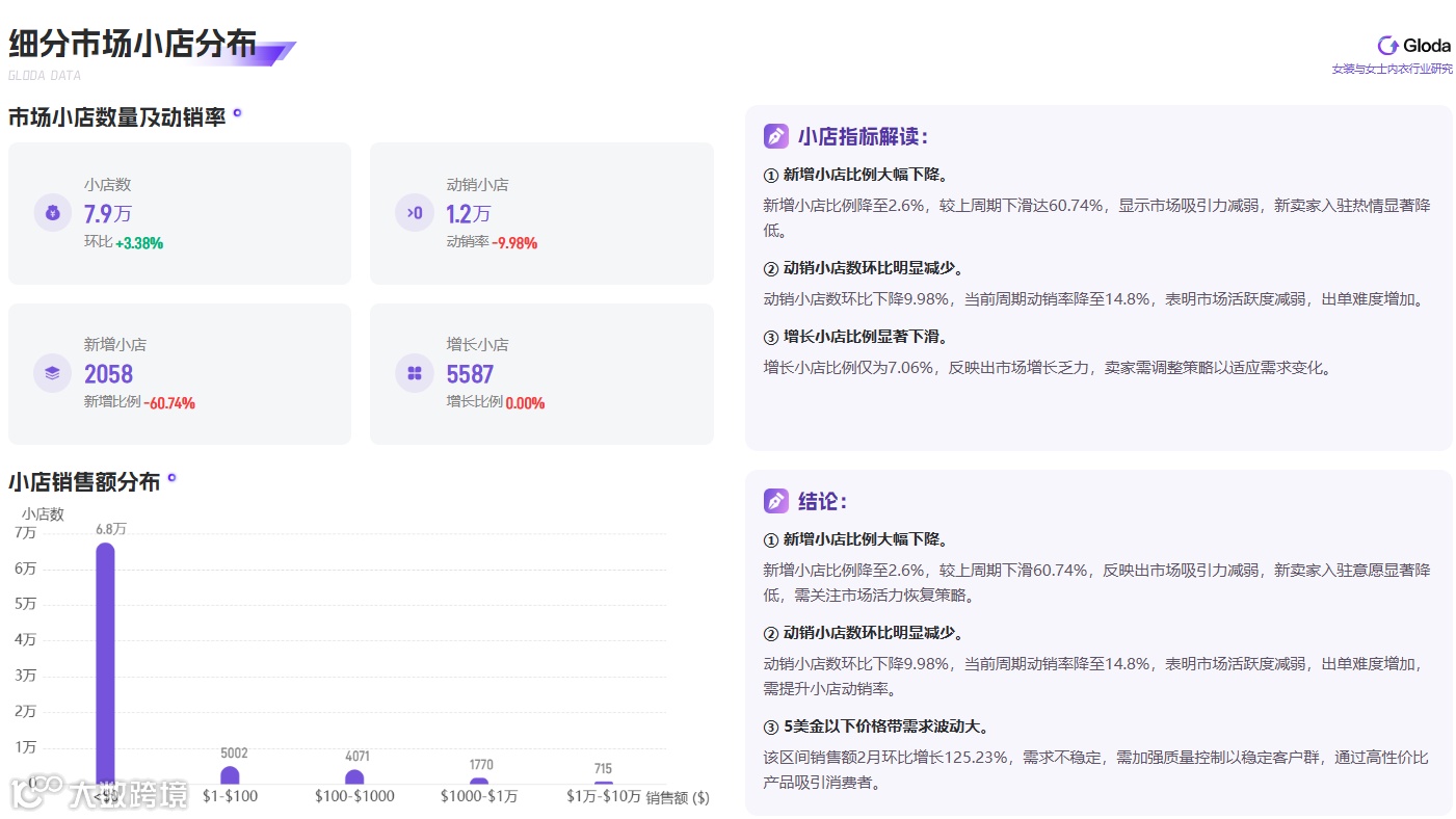 市场中小店数量的变化和运营情况,直接反映了行业的竞争态势和发展趋势。数据显示,小店总数为7.9万,环比增长3.38%,这意味着市场参与者的增加,但增长背后的质量和竞争力不容忽视。新增小店数量为2058家,新增比例的大幅下降,反映出新卖家对市场前景的谨慎态度。
