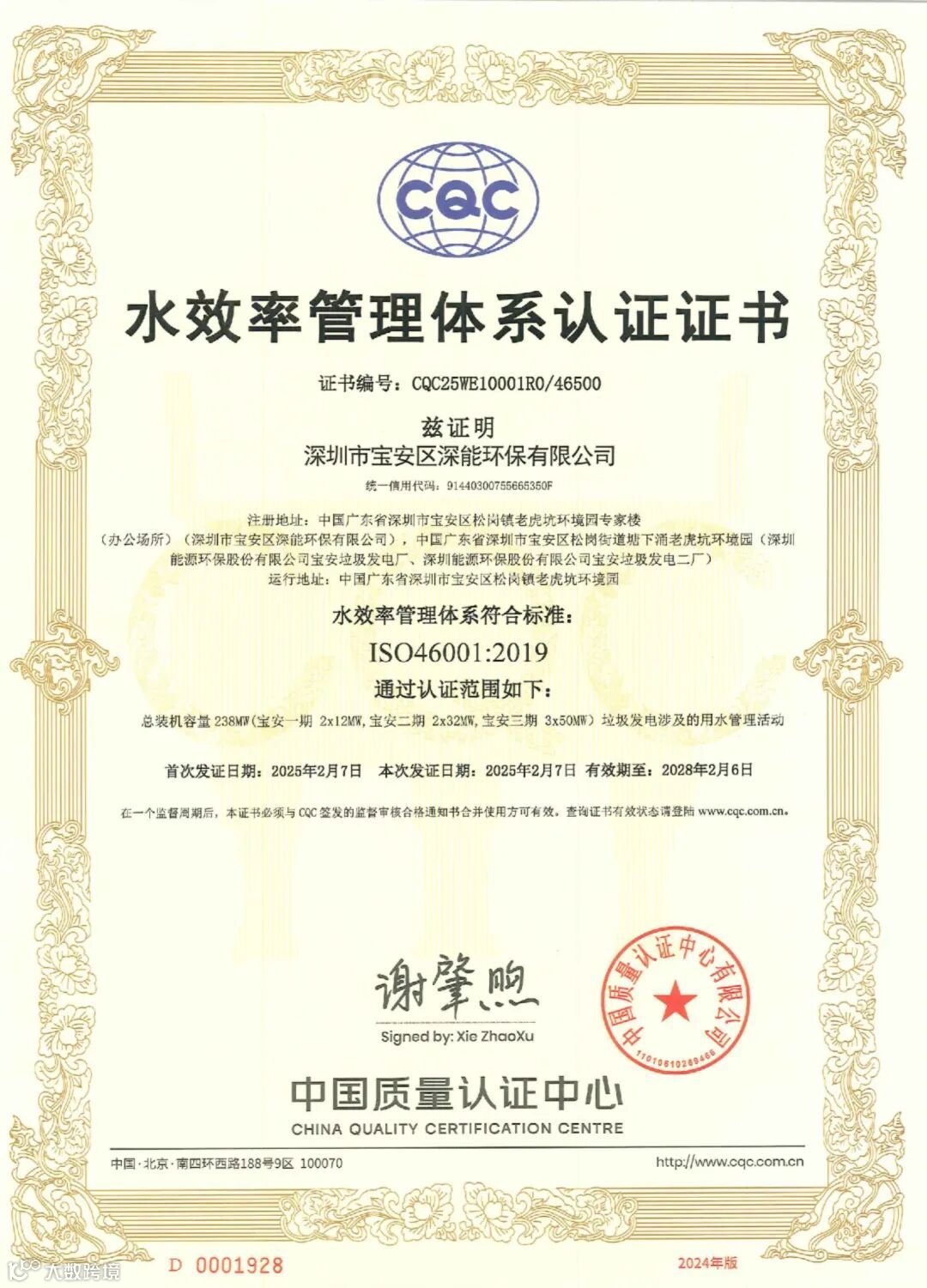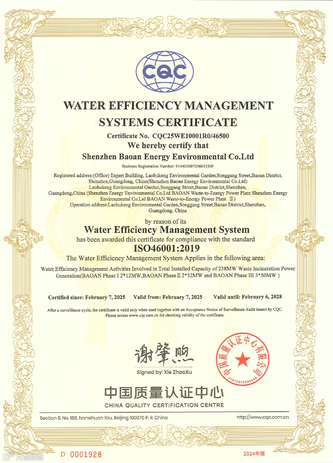 近日,由深能环保所属深圳市宝安区深能环保有限公司建设运营的宝安能源生态园,成功获得由中国质量认证中心颁发的“水效率管理体系认证证书”,成为国内垃圾焚烧发电行业首家获ISO46001:2019水效率管理体系认证的企业,实现了该领域“零的突破”,体现了深能环保为行业在水效率管理方面作出的突出贡献。