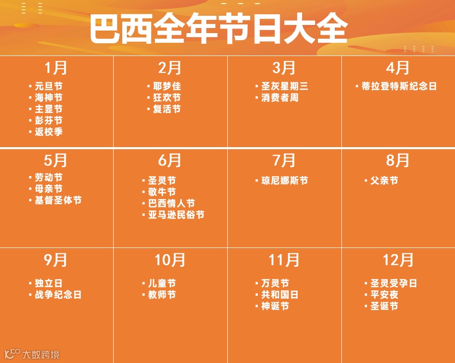 巴西是世界上人口最多的拉美国家,拥有超过2.12亿人口。巴西人口分布不均,大部分集中在东海岸和南部地区,包括圣保罗和里约热内卢。巴西也是南美洲最大的经济体,也是世界上最大的新兴市场经济体之一。巴西的经济以农业、制造业和服务业为主,其中农业是巴西经济的重要支柱之一。巴西是世界上最大的咖啡、橙汁、牛肉和糖等农产品出口国。此外,巴西在制造业和服务业方面也有着很高的实力,其中包括航空、汽车、信息技术、金融等领域。巴西以其热闹和喜庆的文化而闻名,因此全年都有许多重要的庆祝活动和节日。这些节日也将是后续电商活动中,最好的优惠噱头。如狂欢节、除夕夜、复活节、独立日、亡灵节、圣诞节等···