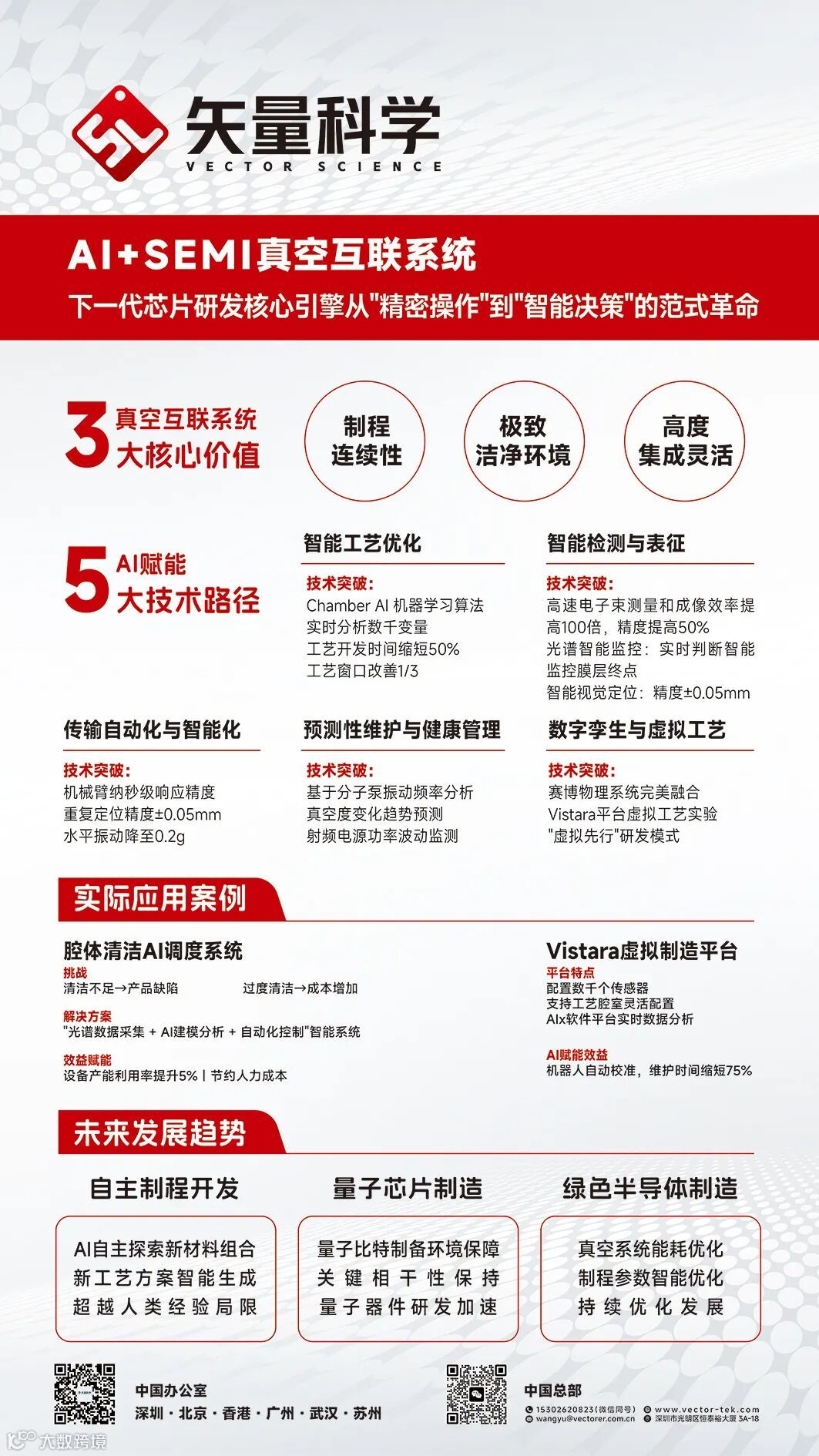 目前,「矢量集团 SEMIX」正全方位布局未来核心战略方向“AI+SEMIX”,涵盖五大关键领域AI+SEMI装备、AI+SEMI厂务、AI+SEMI Recipe、AI+SEMI真空互联系统、AI+材料筛选与研发。AI+SEMIX不仅是技术的叠加,更是一次深刻的范式革命,旨在通过AI驱动实现全链条的效能跃升,为客户创造指数级价值!