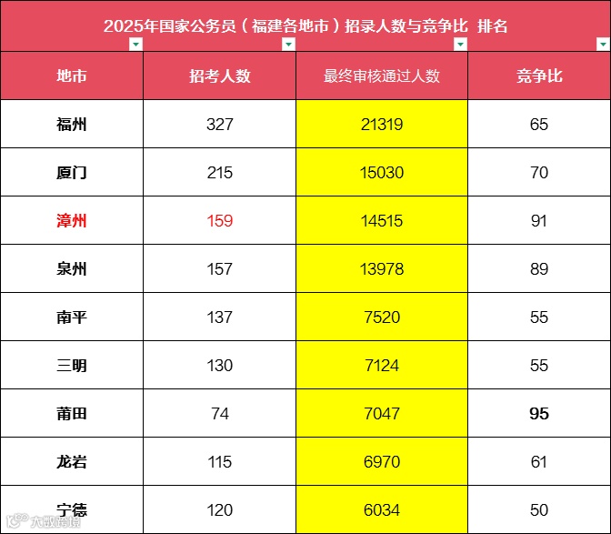从去年报考情况来看,福建省内竞争最大为莆田平均竞争95:1,其次到漳州了91:1,排三是泉州89:1。