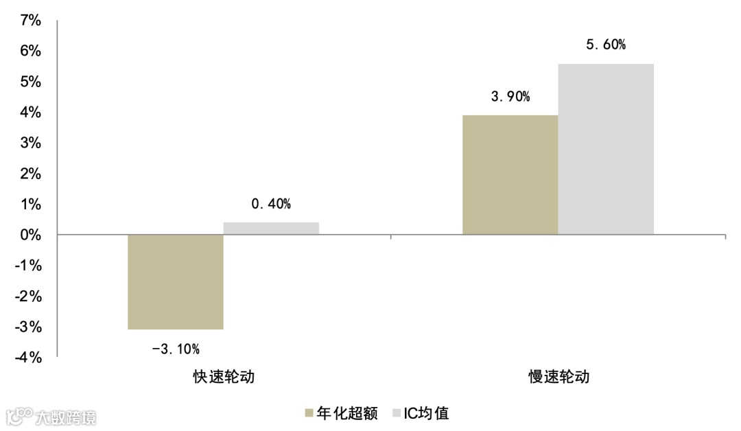 研究发现,多数基本面因子在快速轮动阶段有效性下降,而价量因子表现相对稳健[k]。以成长复合因子为例,在慢速轮动下IC均值达5.6%、年化超额3.9%,而在快速轮动下IC均值仅为0.4%、年化超额-3.1%,预测能力显著减弱[k]。据此,本文将轮动速度分域纳入因子筛选流程。
