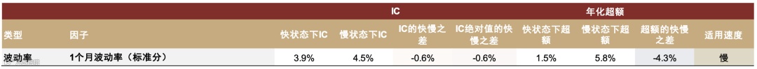- 波动率因子: 如1个月波动率(标准分),在慢速轮动下IC均值为4.5%、年化超额5.8%,优于快速轮动下的3.9%和1.5%,表明其更适合市场主线明确阶段[k];