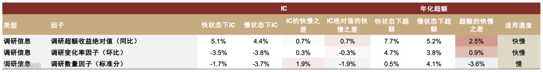 - 调研信息因子: 调研数量因子在慢速轮动下IC为-3.7%、年化超额4.1%,快速轮动下预测能力减弱;而调研超额收益绝对值因子在快慢状态下均表现稳健,IC分别为5.1%和4.4%,具备普适性[k]。