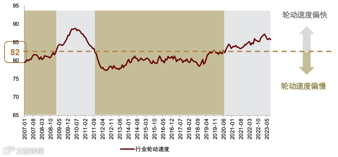 注:灰色色块代表轮动速度偏快,绿色色块代表轮动速度偏慢;数据区间为2007年1月至2023年7月