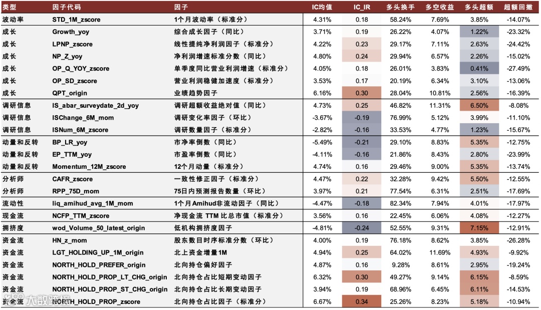 全时点测试共筛选出24个有效因子,涵盖9大类别[k]。其中资金流类北向持仓占比因子(IC_IR 0.34)和业绩趋势因子(IC_IR 0.30)稳定性佳,低机构拥挤度因子年化多头超额达7.15%,表现突出[k]。