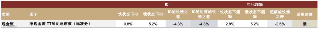 现金流因子衡量现金流估值与基本面,采用净现金流TTM比总市值(标准分)因子,全时点IC均值3.56%,IC_IR绝对值0.16,年化超额收益4.08%。该因子在慢轮动状态下IC均值达5.2%,年化超额5.2%;而在快轮动下IC下降4.3个百分点,收益降至2.8%。因子经标准化处理反映长期现金流趋势,更适合轮动较慢、基本面主导的市场阶段[k]。