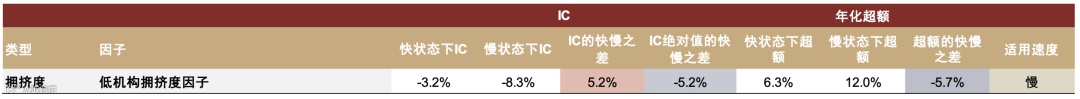 拥挤度因子衡量行业交易密集度与关注度,在行业层面为正向因子,体现资金流向与情绪。低机构拥挤度因子全时点IC均值-4.81%,IC_IR绝对值0.24,年化超额7.15%,稳定性强。在慢轮动状态下IC均值达-8.3%,年化超额12.0%;快轮动下显著下降5.2个百分点。因子在2021年前稳定性强,之后有效性波动加大,表明其在稳定市场中更能体现机构资金情绪的盈利潜力[k]。
