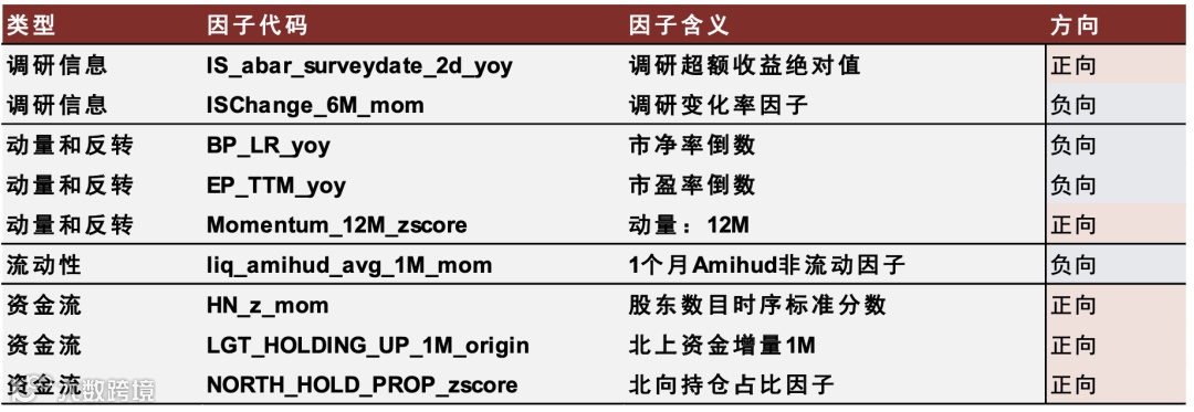 - 快速轮动模型包含调研信息、动量反转、流动性、资金流等4大类共9个因子;