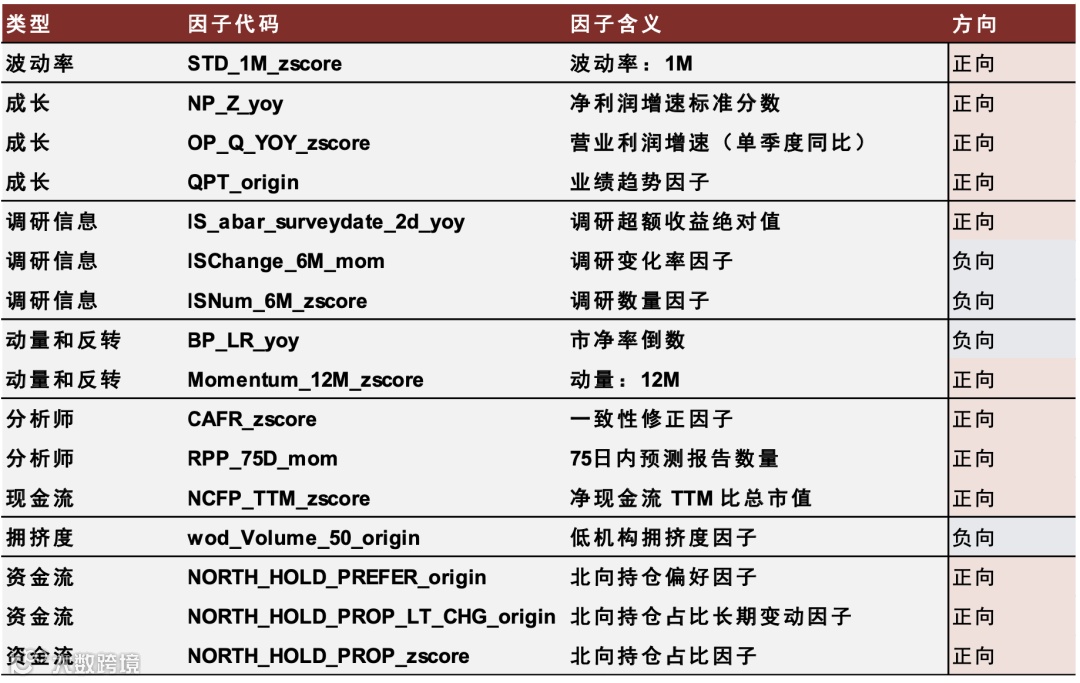 - 慢速轮动模型包含波动率、成长、分析师、现金流等8大类共16个因子[k]。