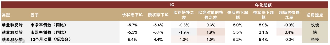 图表27:动量和反转因子轮动速度分域IC和超额统计