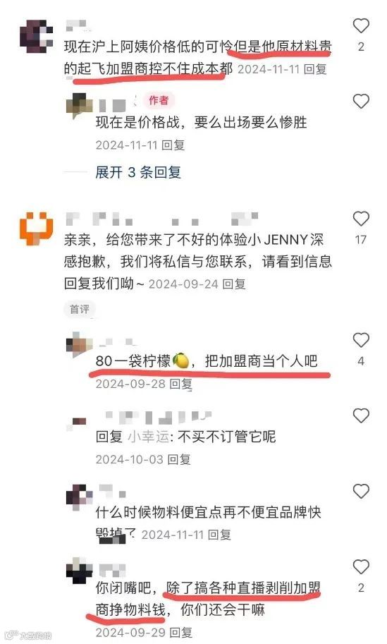 尽管品牌方稳收物料与服务费用,加盟商却面临高企的原料采购成本、租金压力以及日益激烈的市场竞争[[k]]。部分加盟商在社交平台反映,品牌原料价格过高,例如“一袋柠檬80元”,且在价格战中未对加盟商提供成本支持,导致盈利困难[[k]]。