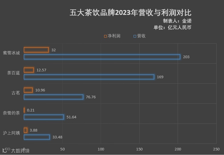 2023年,沪上阿姨营收33.48亿元,远低于蜜雪冰城(203亿元)与茶百道(169亿元),在主要品牌中垫底[[k]]
