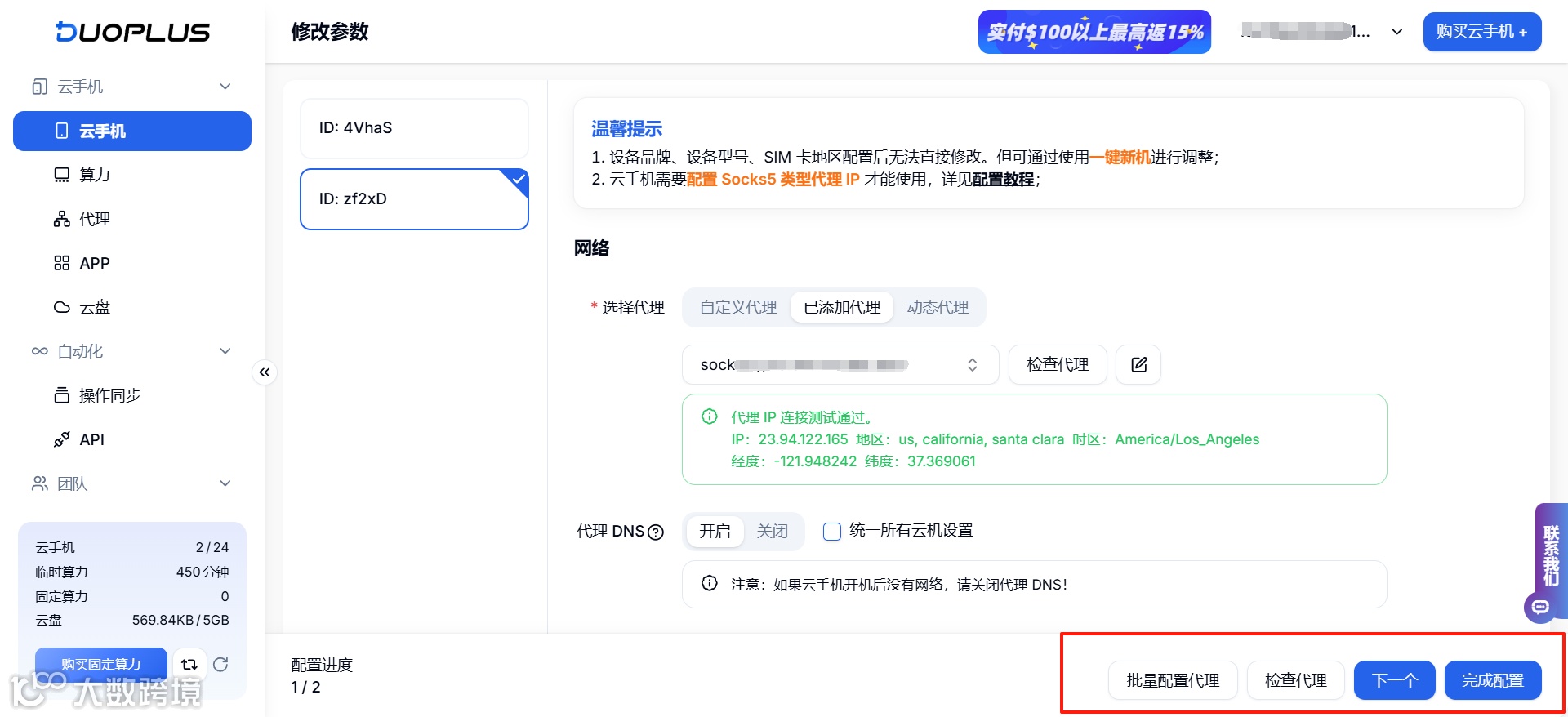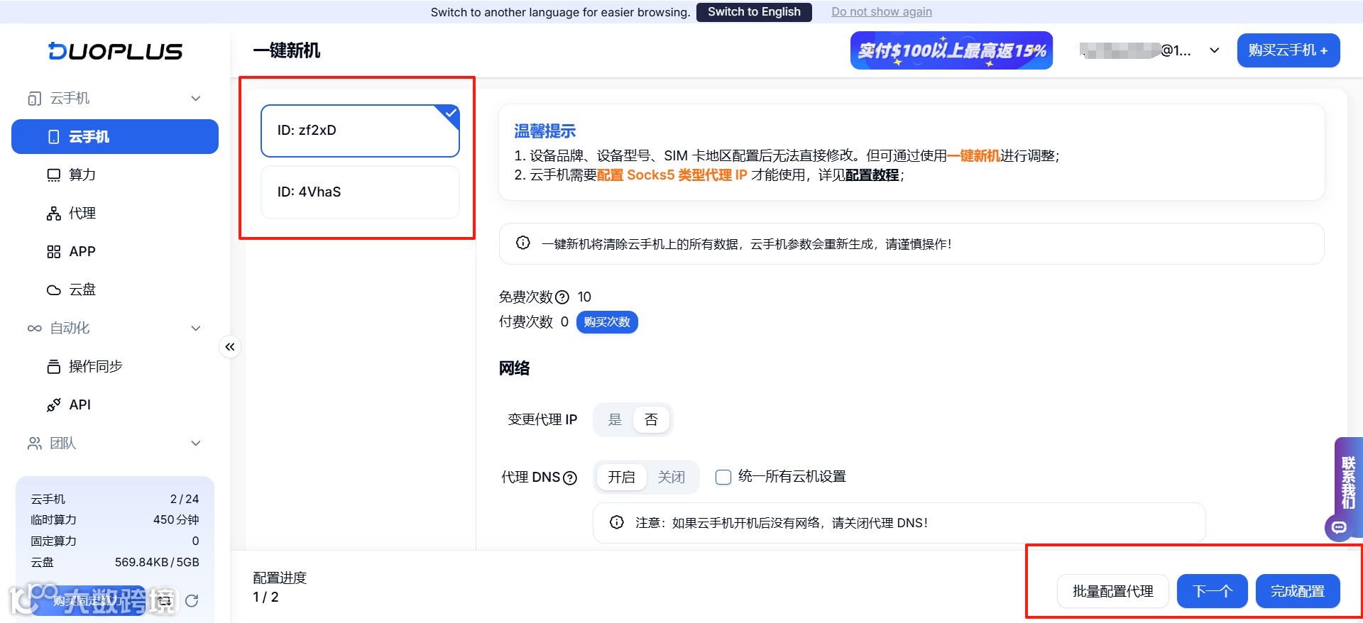 对于想要更新云手机的用户,DuoPlus新增批量一键新机功能,并支持单独配置代理和批量配置代理,统一集中完成设备的更新,帮助减少操作时间。