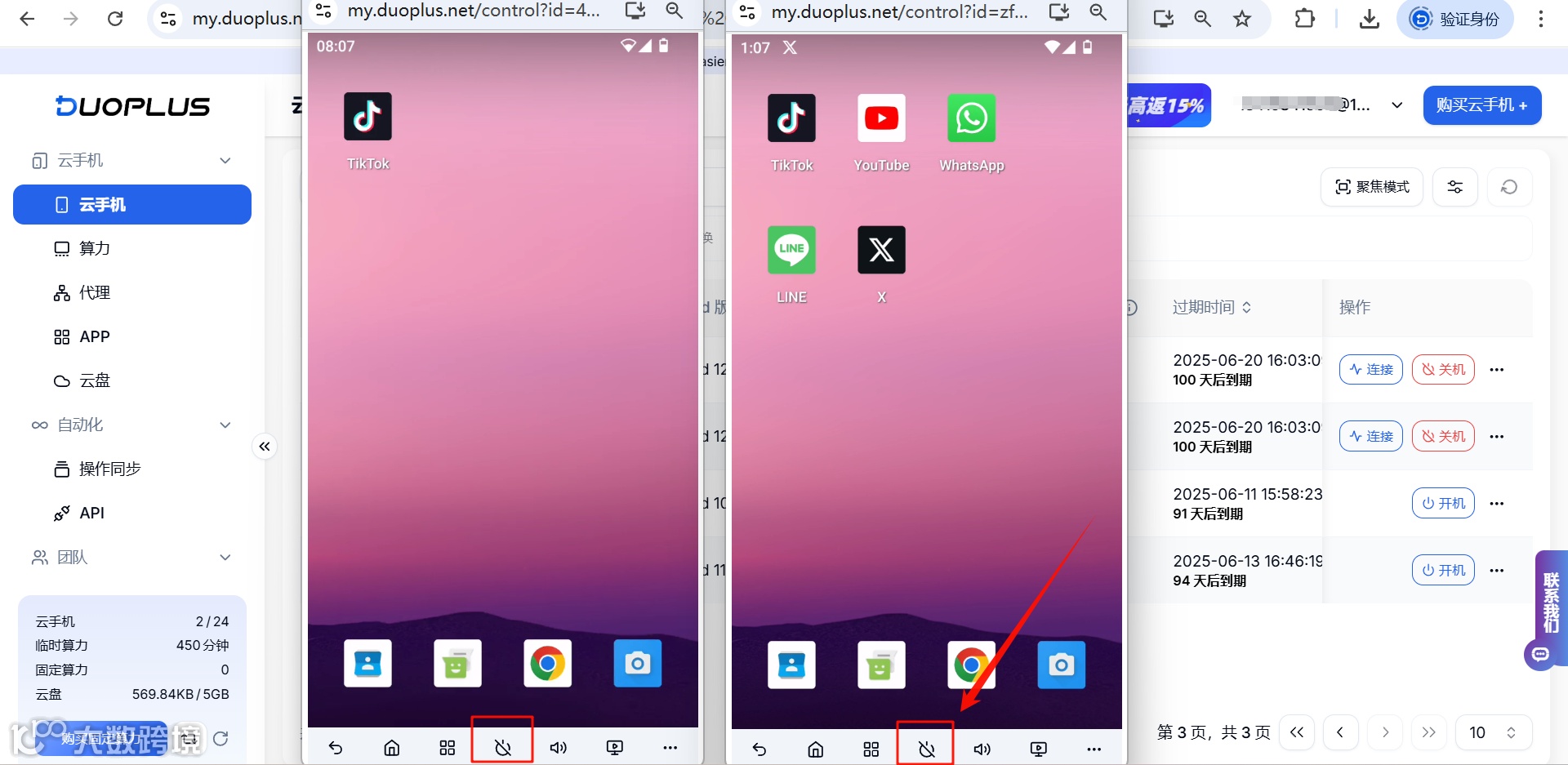 DuoPlus将云手机内部的关机按钮移至主界面下方,操作简单直观,方便用户快速关闭云手机。