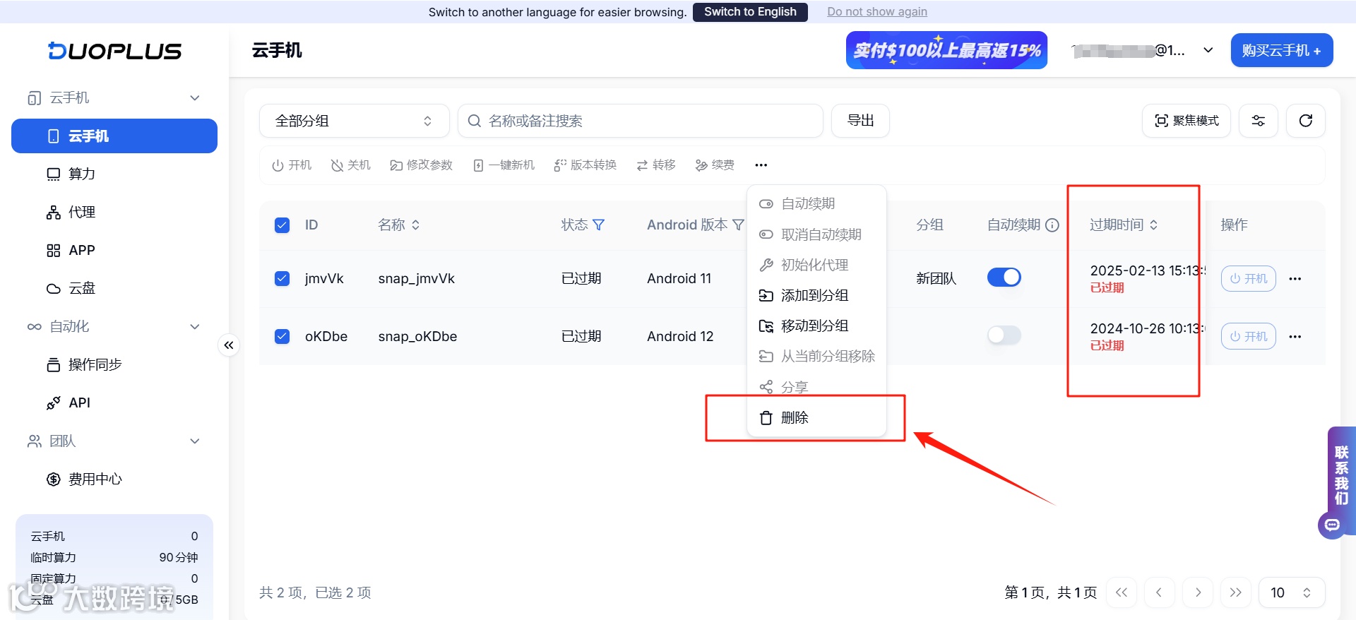 DuoPlus云手机列表支持删除已过期、过期待续费的云手机,可以单台云手机进行删除,也可以批量删除,帮助用户简化资源管理,查找云手机更方便。