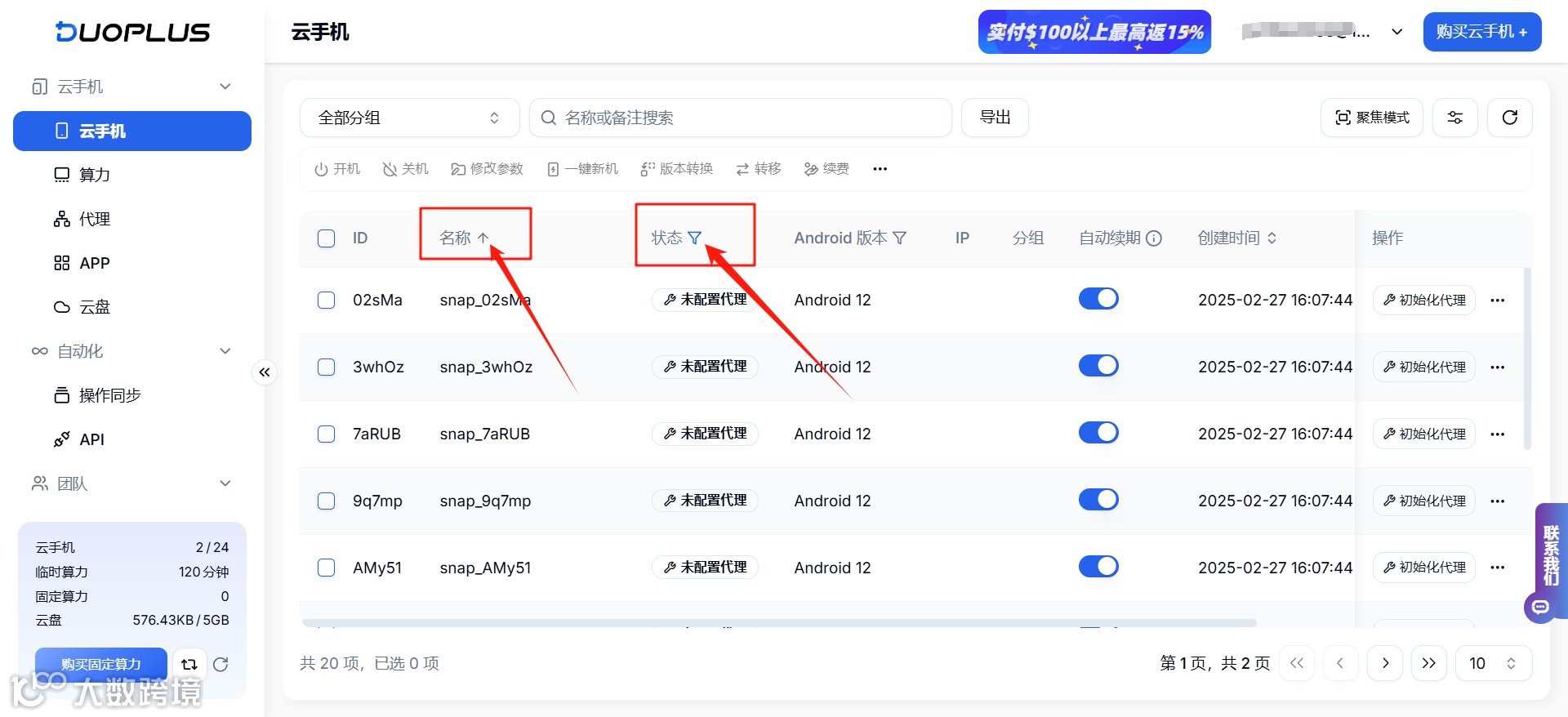 DuoPlus新增过滤字段自动保存,用户设置的筛选、排序条件在刷新页面后仍然生效,无需重新选择,减少重复操作,保持操作的连续性。