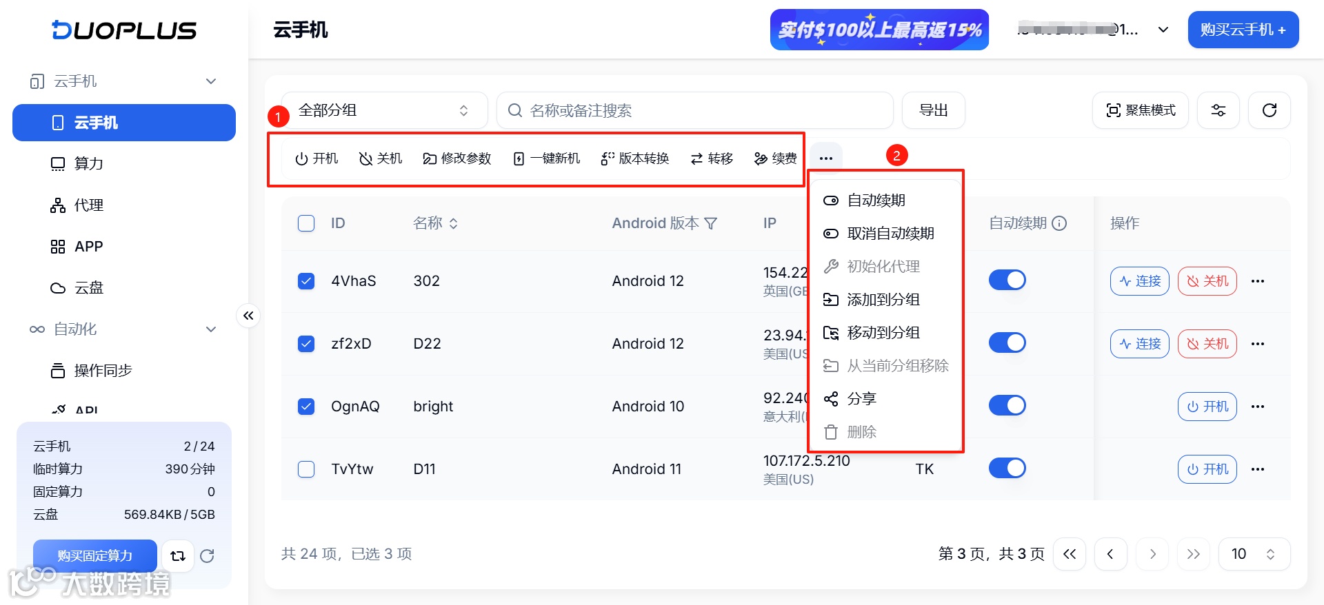 - 批量操作体验优化:DuoPlus对云手机的批量功能菜单进行调整
