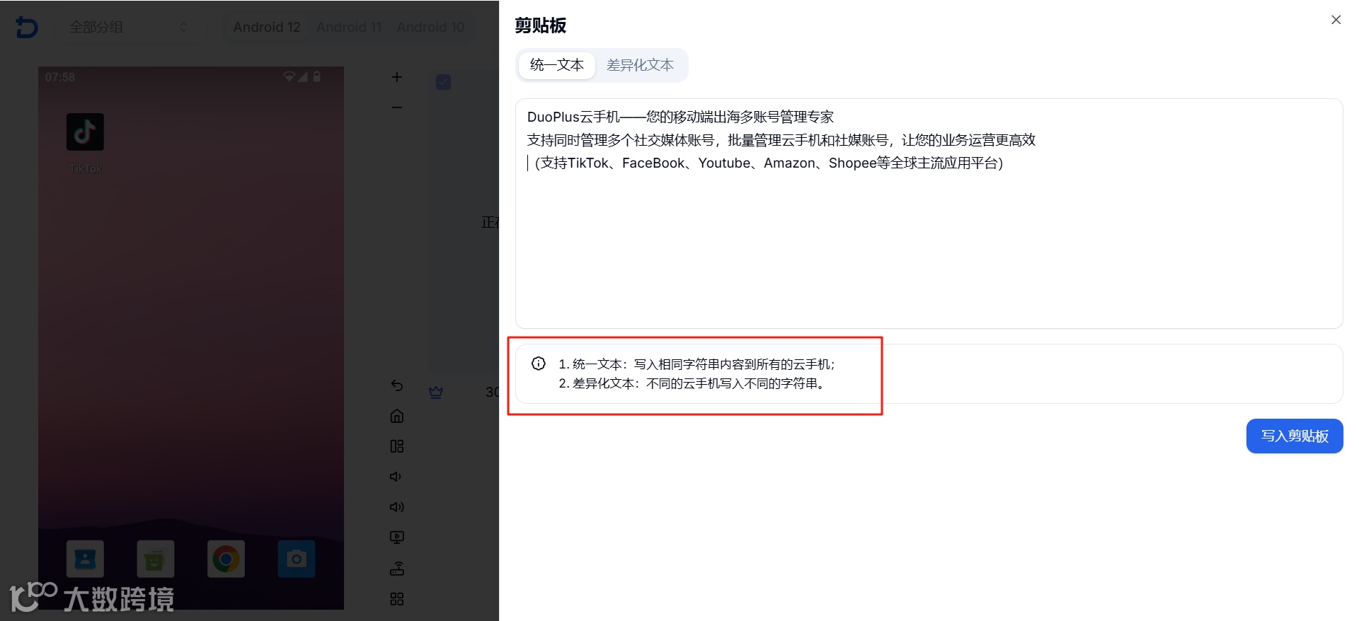 DuoPlus的操作同步功能再上新,添加了【剪贴板】功能,支持用户写入内容,可以快速复制和粘贴信息到云手机,提高工作效率。