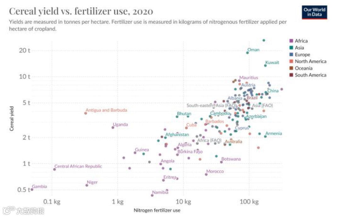 1961–2021年,全球粮食产量增长256%,超过同期人口增速(150%),主要得益于单产提升而非耕地扩张[k]。绿色革命带来的高产种子、化肥使用与机械化技术,显著提高了发展中国家谷物产量——过去50年产量翻两番,而耕地仅增30%[k]。化肥施用量与作物单产呈现显著正相关关系,全球氮磷钾总用量从1960年的3354万吨增至2020年的2.13亿吨,复合增速达3.23%[k]。