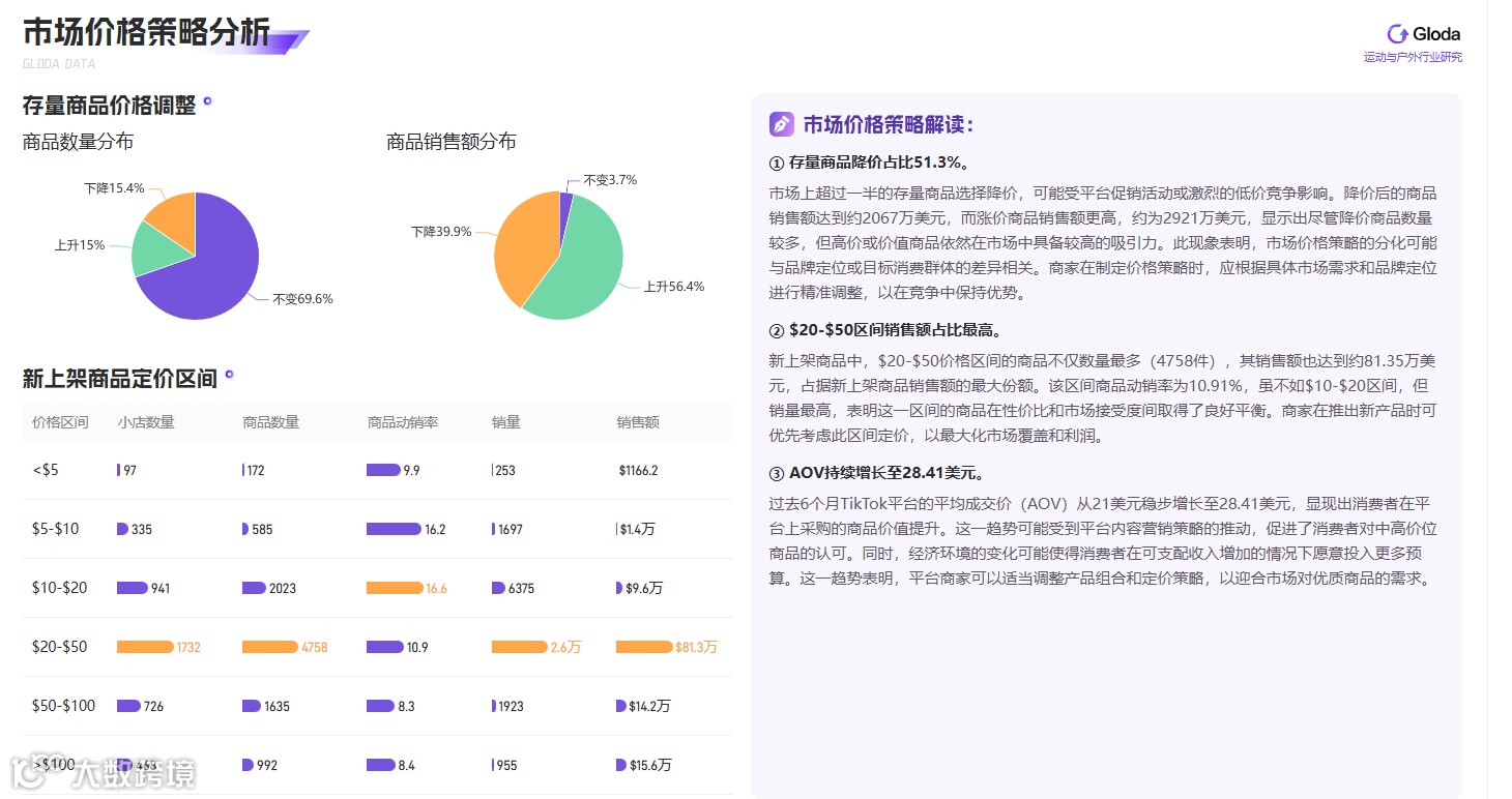 美国TikTok运动与户外行业市场正处在一个充满机遇与挑战的十字路口。一方面,市场整体销量和销售额表现良好,显示出一定的消费潜力;另一方面,小店的动销率和新增比例下降,市场竞争加剧,价格策略的分化也反映出市场的复杂性。商家需要在产品定价、店铺运营、市场动态把握以及品牌建设等方面进行全面的策略调整和优化。