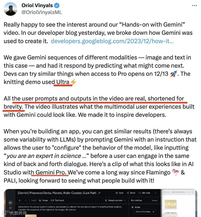 谷歌DeepMind研究与深度学习主管奥里奥·维尼亚尔斯(Oriol Vinyals)再度自证,在X平台上发文称:“视频中的所有用户提示和输出都是真实的,简洁起见做了缩减”,并发布了一段Gemini Pro的对应演示视频。