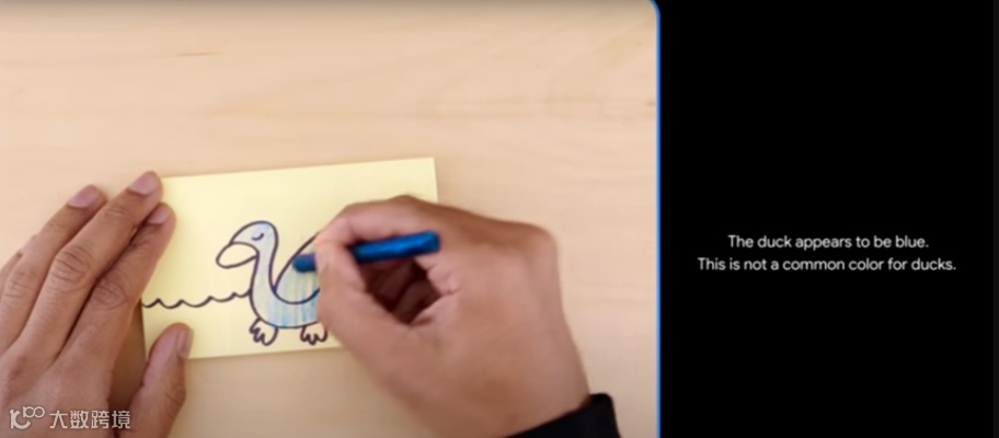 在第一个演示中,Gemini识别了一个鸭子素描从一条线到完整画面的演变过程。当演示者将鸭子素描填满蓝色颜料时,Gemini指出鸭子通常是棕色、白色或黑色的,蓝色可不是鸭子常见的颜色。