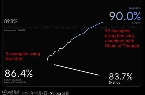 Gemini Ultra还是首个在MMLU任务上表现优于人类专家的大模型,得分率高达90.0%。而人类专家的成绩为89.8%,GPT-4则为86.4%。