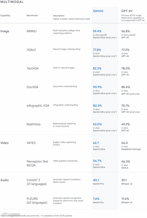 谷歌此次毫不避讳与GPT-4对决的雄心。在Gemini发布前,谷歌对它进行了一系列以标准行业指标评估的测试。