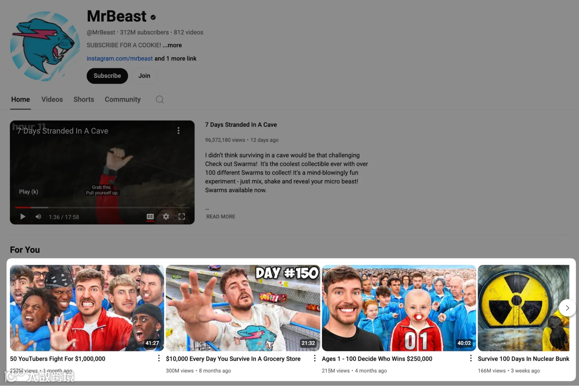 MrBeast(又名詹姆斯·斯蒂芬·"吉米"·唐纳森)在创建自定义缩略图方面是个传奇。他说他在每个视频的缩略图上花费5000到10000美元(约35000-70000元人民币),因为一个好的缩略图可能意味着5000万次观看和2亿次观看之间的差别。