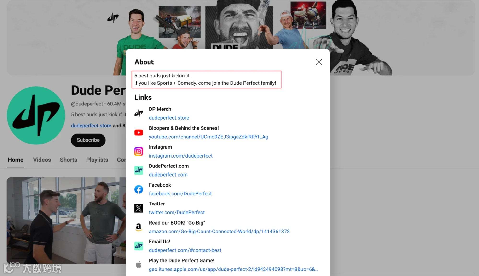 例如,Dude Perfect拥有超过6000万YouTube订阅者,频道描述很简单:"5个好朋友一起玩。如果你喜欢体育+喜剧,来加入Dude Perfect大家庭吧!"两句话就告诉观众订阅频道时可以期待什么。