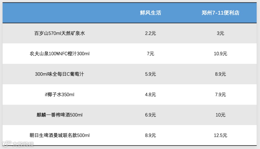 图:鲜风生活与7-11便利店部分商品的价格对比