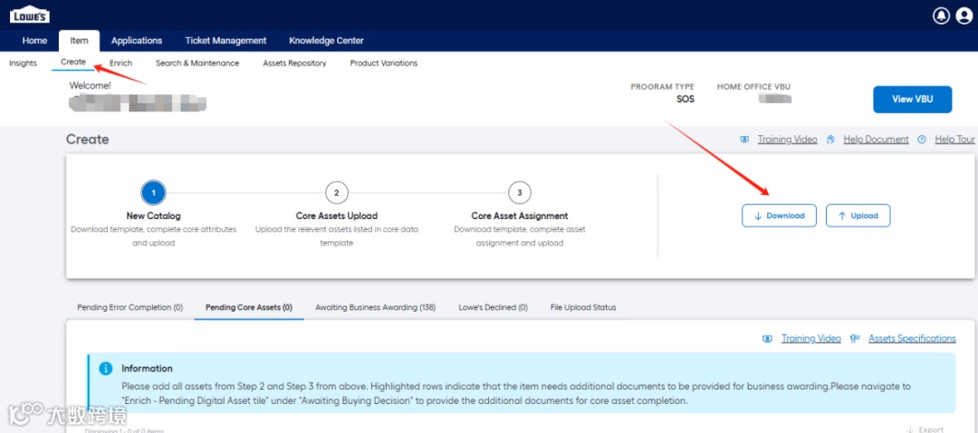 1.下载模板,在Vendor Gateway中,点击Item按钮,然后选择Create。点击Download Template下载产品信息表格,并按照要求填写产品信息。